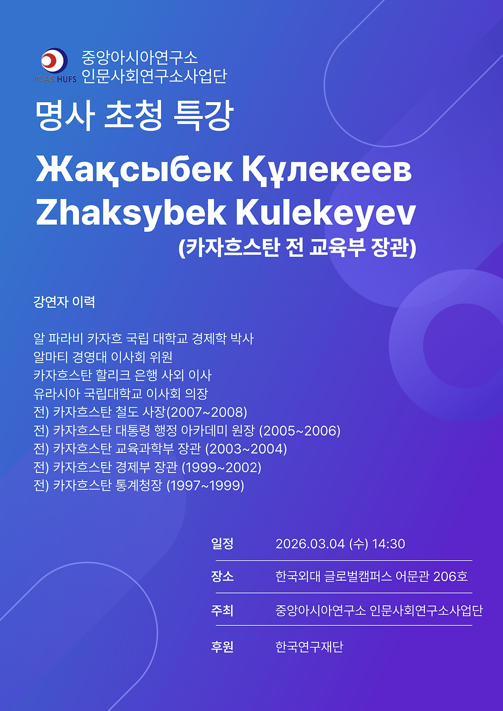 강연자 : 카자흐스탄 전 교육부장관 Жақсыбек Құлекеев (Zhaksybek Kulekeyev)