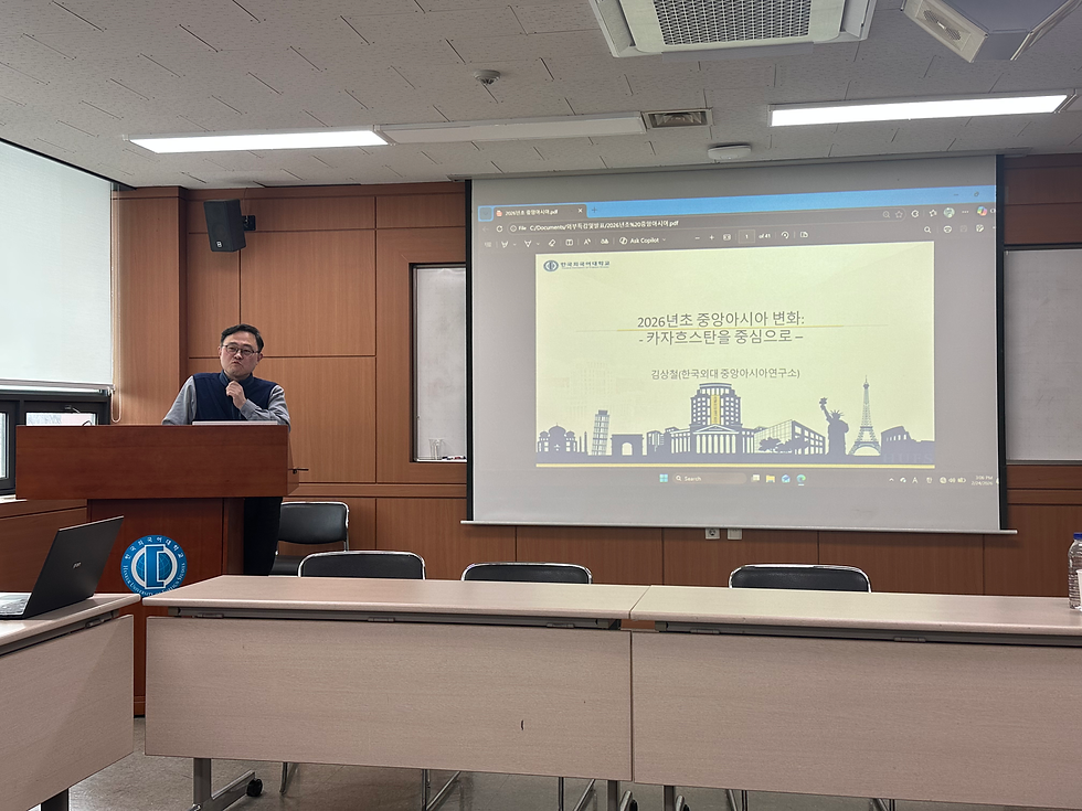 이어 동 사업단 김상철 전임연구원은 인문사회연구사업단 연구주제와 관련된 “2026년 초 중앙아시아 변화”를 주제로 발표를 진행하였다. 카자흐스탄을 중심으로 진행된 본 발표에서는 카자흐스탄을 비롯한 중앙아시아 국가들의 역내 협력 강화 및 강대국으로 도약하기 위한 전략 분석 결과가 제시되었다.